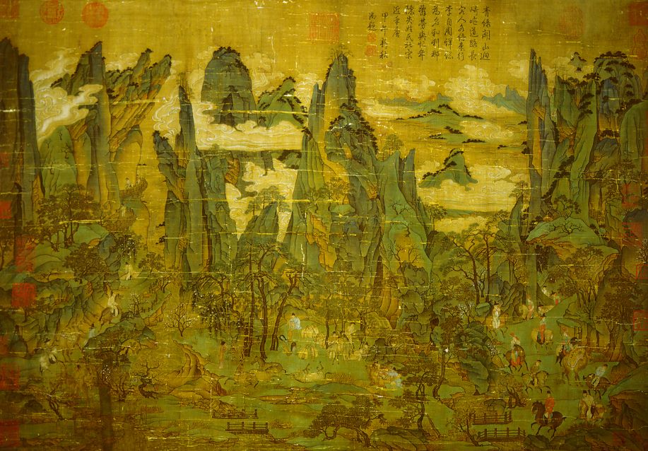 夜白,出栈道飞仙岭下,乍见小桥,马惊不进。笔法精劲工细,青绿设色,绚灿华丽。