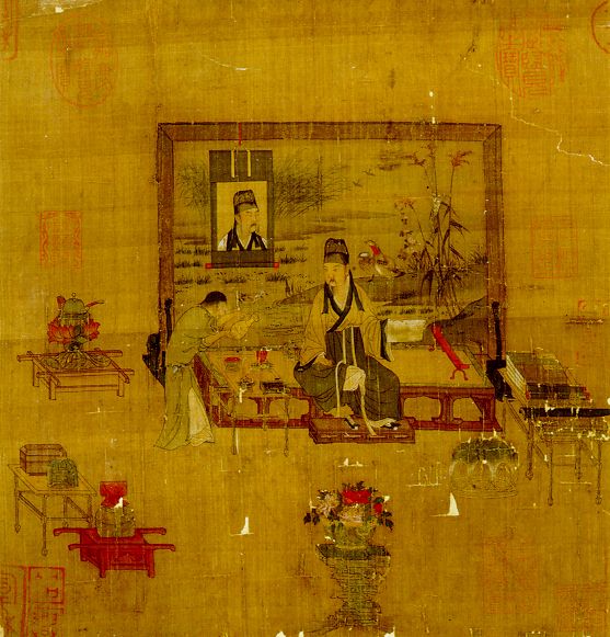 器皿。幅上有宋徽宗、高宗诸印。人物衣褶,用笔与韩干牧马图颇近。